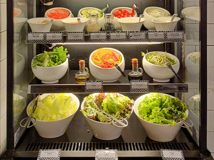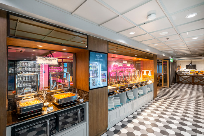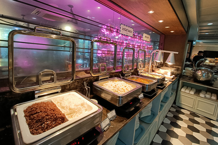 Each morning features new dishes — from Thai and Indian specialties to international favorites — except for the American breakfast corner, which keeps its beloved classics like eggs, sausages, and toast available daily.